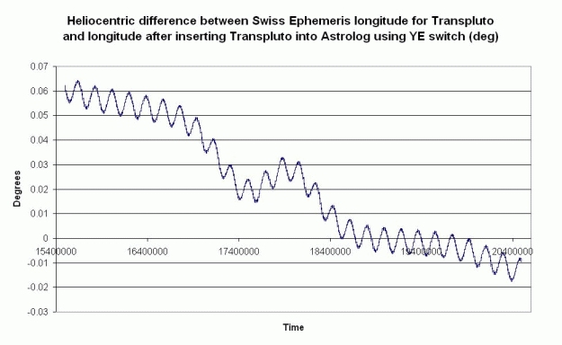 This gives a reasonably high amount of accuracy when compared to the Swiss Ephemeris heliocentric longitudes. Below is a graph which shows the difference between the Astrolog ephemeris heliocentric longitudes after the use of the above switch for Transpluto, and the Swiss Ephemeris values. The graph covers the time period 1550 to 2050. As you can see the greatest difference is about 0.0644 degrees, or about 3.8 minutes of arc. The Swiss Ephemeris says: "Even if Sevin's computation were correct, it could only provide a rough position. To rely on arc minutes would be illusory." Taking this into account, the result is very good.
