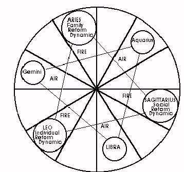 We could have selected other titles for the Reform Dynamics, but this term explains qualities and relationships which could not be reached by other terms. To match each Survival Dynamic, there is a Reform Dynamic, and the three Reform Dynamics present us with another perfect equilateral triangle within the geometrical frame of reference we call the zodiac. As in all geometry and elsewhere through-out the study of mathematics, in astrology we always find perfect symmetry, design and balance.