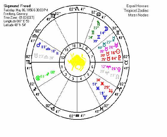 Another chart has been offered as that of Freud in other astrological literature, giving a 9:00 A.M. birth time, but we had to reject the chart at the start. We are depending on his biographer plus the fact that one look at a photograph of Freud will display all of the facial characteristics of Scorpio rising -- not Cancer.
