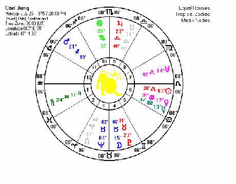 Had Freud studied astrology and had he been able to completely overcome the scorpion side of his nature, he would have realized that Jung was born at the exact top of his (Freud's) lunar cycle, and here was a philosopher who could have been of much greater help than Freud ever realized. Jung's chart is given below.
