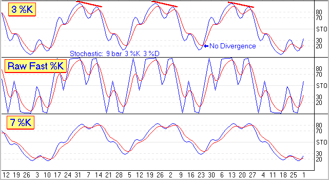 ( Last - GroupLow ) / GroupRange. In these examples, the %K