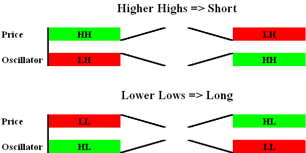 - Higher highs in price and lower highs in the oscillator which