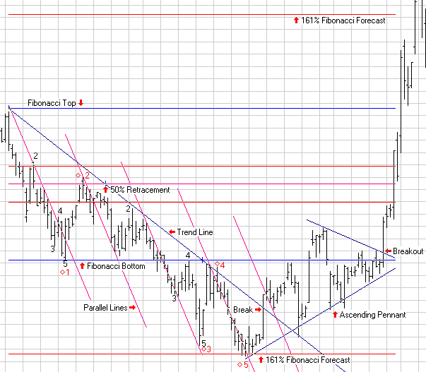 placing a Gann fan on the chart to show the 1x1 line.