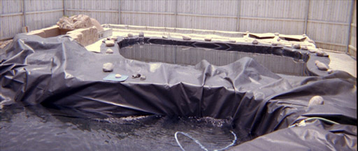 - You can see the Permalon liner has been placed in the Fish Pond. The Fish Pond is being filled. The liner has not yet been trimmed.